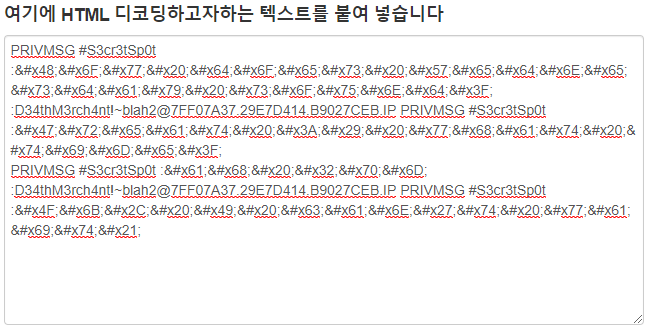 인코딩 된 문자열들을 보면 16진수로 이루어졌고 각각 세미콜론(;)으로 1바이트씩 나누었다. 이를 보면 HTML 인코딩이 된 것이라 추측된다. HTML디코딩을 위한 웹사이트에 들어가 문자열을 복호화한다.