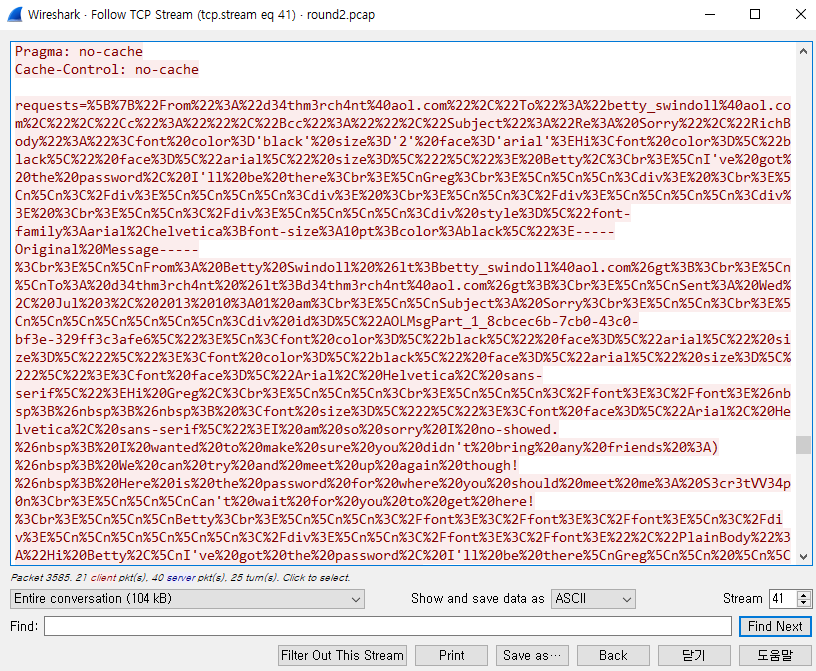 41번 세션을 보면 메일을 주고 받으며 전한 메시지 내용이 적혀있다. 이를 디코딩 해보면