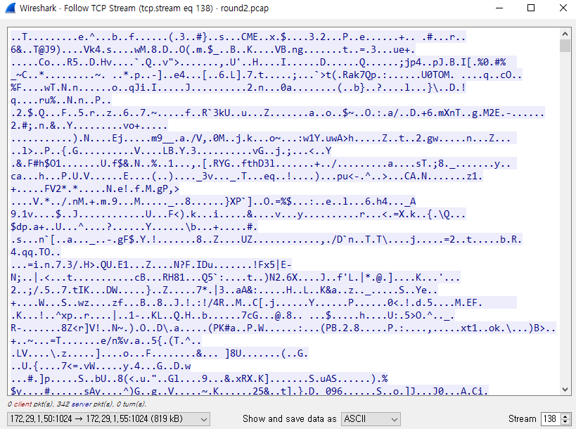 1024번 포트로 전송된 패킷을 보면 파일 크기가 819KB로 전에 DCC SEND 서비스를 이용해 전송한 파일 크기 819200과 유사함을 알 수 있다. 비밀번호가 제공되었으므로 암호화된 파일일 것이라 추측된다. raw데이터로 저장하여 복호화를 해보도록 하자.