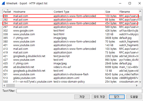 [Conversations] 기능을 통해 전체적인 세션을 보게 되면 별다른 특이점이 보이지 않으므로 [Export - HTTP object list]를 보면 mail을 이용한 흔적이 보인다.