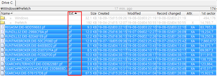 C:\Windows\Prefetch 폴더에서 확장자(Ext.)로 정렬을 해주고 확장자가 pf인 파일만 수집한다. 이 파일들은 PF 폴더를 만들어서 저장한다.