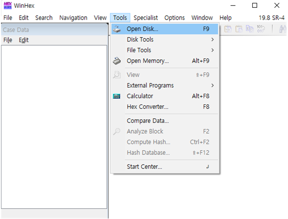 [Tools] - [Open Disk]로 비활성 데이터를 수집할 디스크를 선택.
