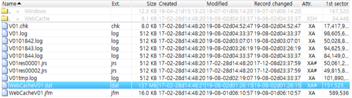 다음으로 웹 브라우저 캐시 파일인 WebCacheV01.dat 파일을 수집한다.