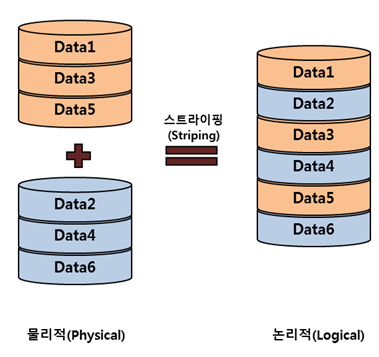성능 향상을 위해 데이터를 1개 이상의 디스크 드라이브에 저장하여 드라이브를 병렬로 사용할 수 있는 기술이다. 즉, 물리적으로 여러 개의 디스크에 나뉘어 저장된 것을 논리적으로 연속된 데이터로 만들어 Reading과 Writing 속도를 올려주는 것이다.